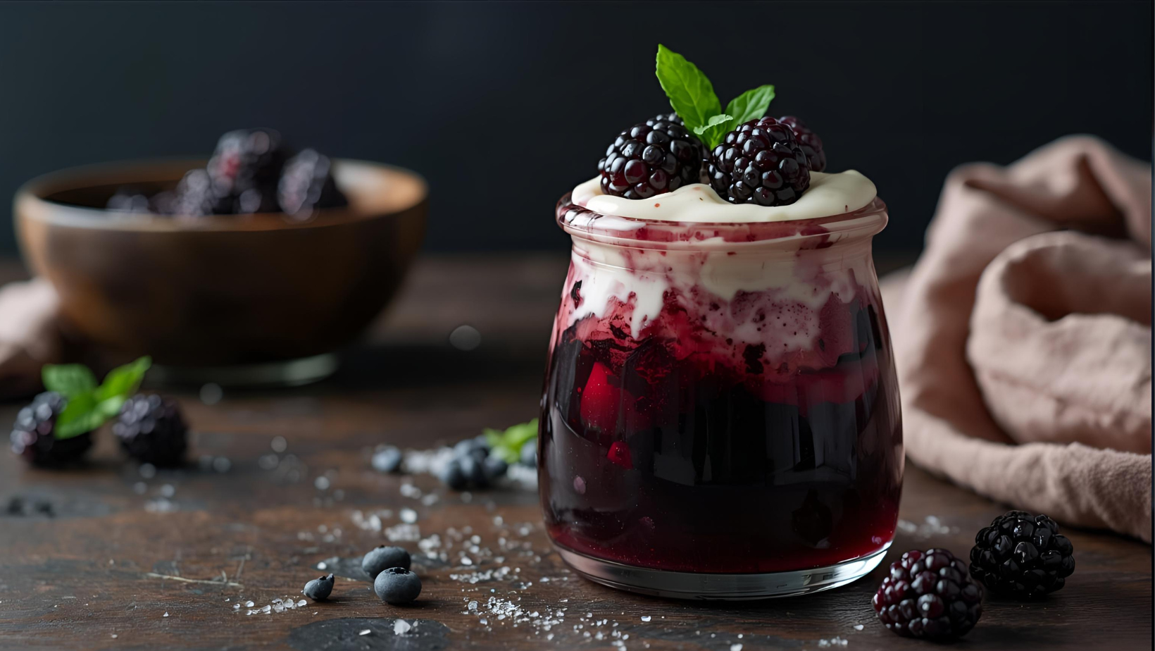 - Sahne steif schlagen, auf das Gelee geben und mit Brombeeren garnieren.